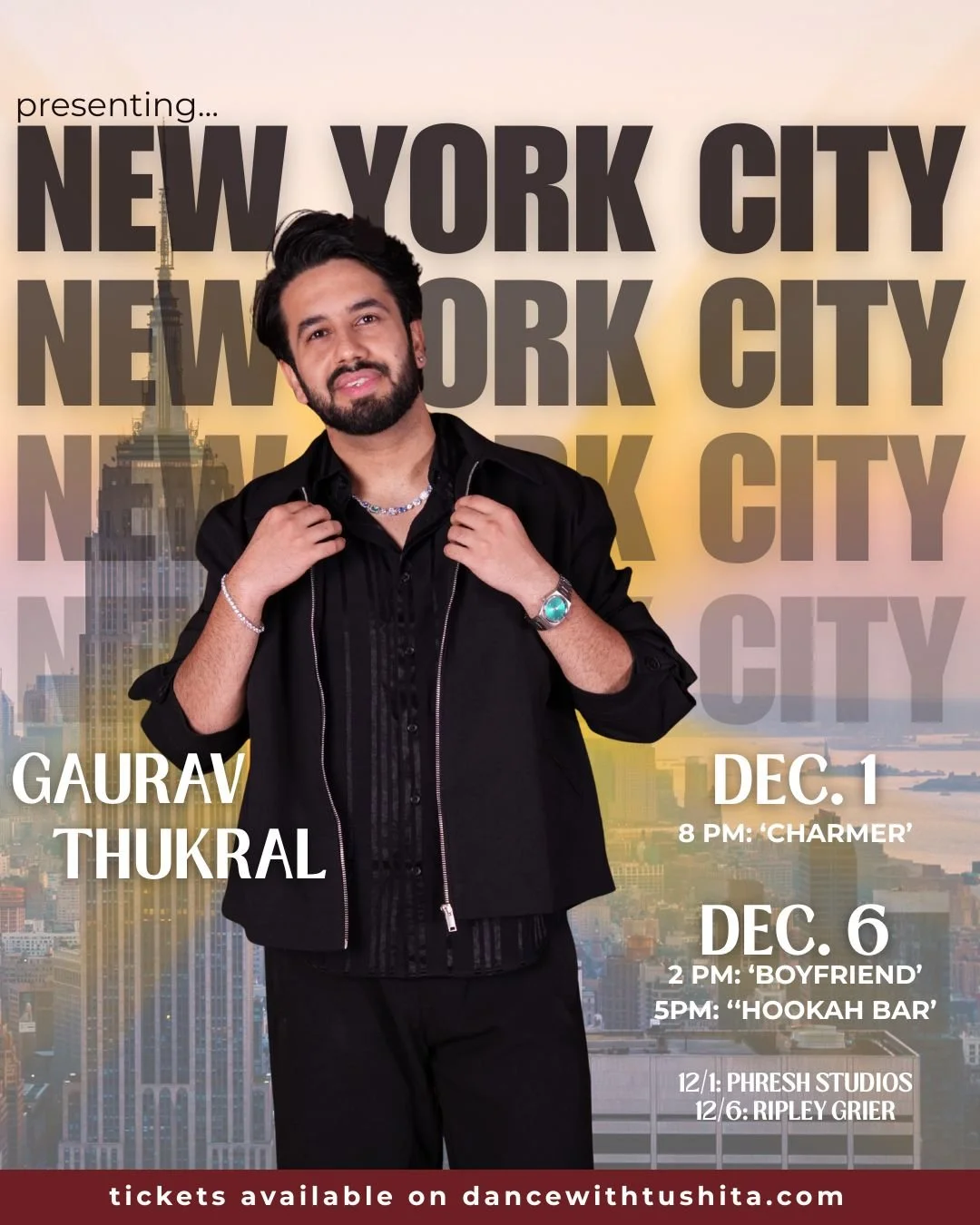 Categories: Select a Category BHANGRA BOLLYWOOD BADDIES BOLLYWOOD FUSION GAURAV IN NYC BHANGRA | BOLLYWOOD BADDIES | BOLLYWOOD FUSION | GAURAV IN NYC | #DWT BEGINNERS BHANGRA 12/2 8-10 PM $25.00 Purchase Added! #DWT LATOO RD 5 12/3 8 PM $25.00 Purchase Added! #DWT BHANGRA FUSION 12/10 7:30 PM $25.00 Purchase Added! GAURAV IN NYC: DEC 1 8 PM 'CHARMER' $30.00 Limited Availability Purchase Added! GAURAV IN NYC: DEC 6 2 PM 'BOYFRIEND' $30.00 Purchase Added! GAURAV IN NYC: DEC 6 5 PM 'HOOKAH BAR' $30.00 Purchase Added! DWT GIFT CARD from $25.00 Select Value $25.00 $50.00 $75.00 $100.00 Purchase Added!